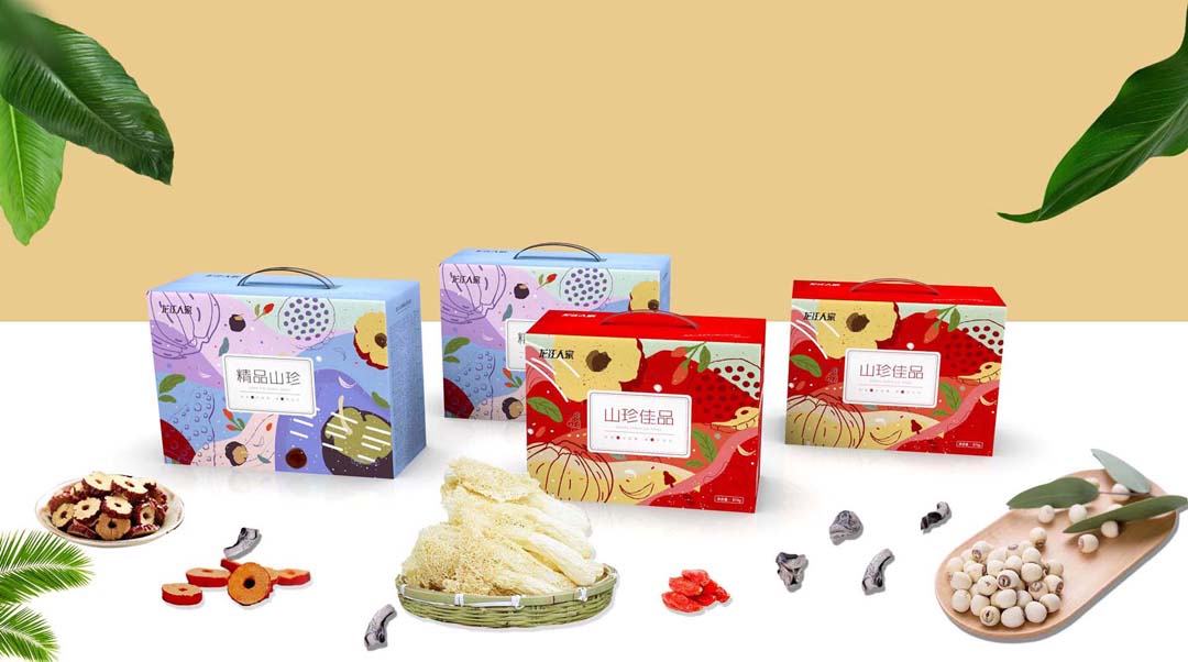 在与客户多次沟通的基础上,渡岸创意团队首先对龙江人家山珍产品,进行了品类整合,并根据企业的品牌属性和不同种类产品的个性,创意和设计了一套完整的山珍产品礼盒包装,使得企业的产品形象得到了大幅度的提升。